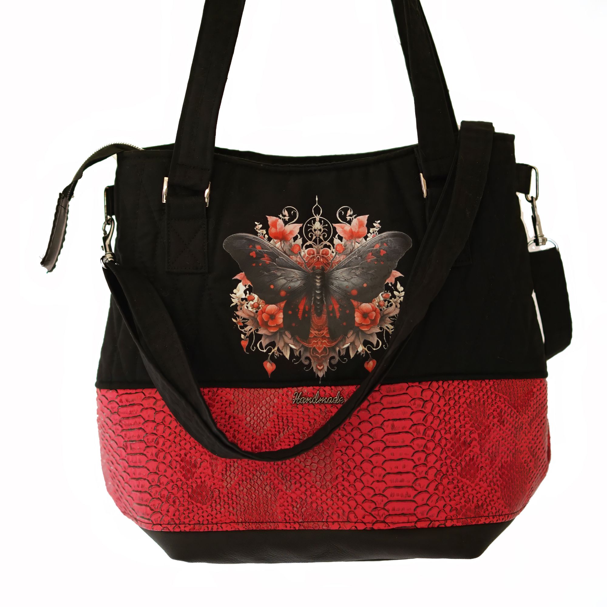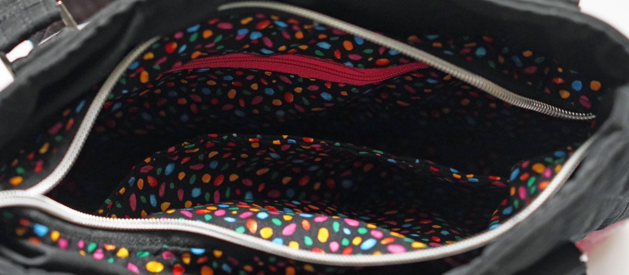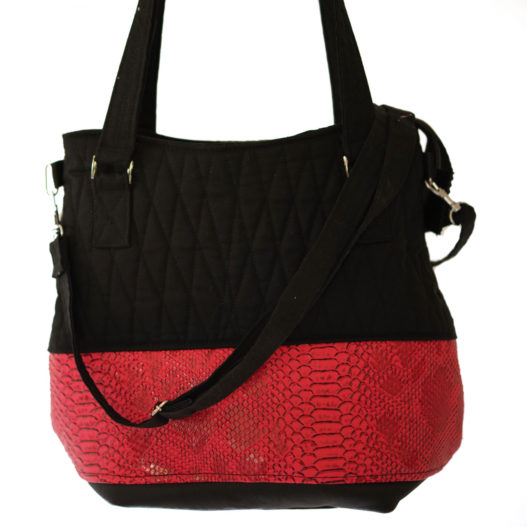 BxHxT ca. 36cm x 30cm x 12cm ; 1 Reißverschlussfach und 1 Steckfach innen ; 2 Henkel je ca.60cm, 1 verstellbarer Gurt ca.140cm ; Material: gesteppte Baumwolle, Kunstleder, Leder