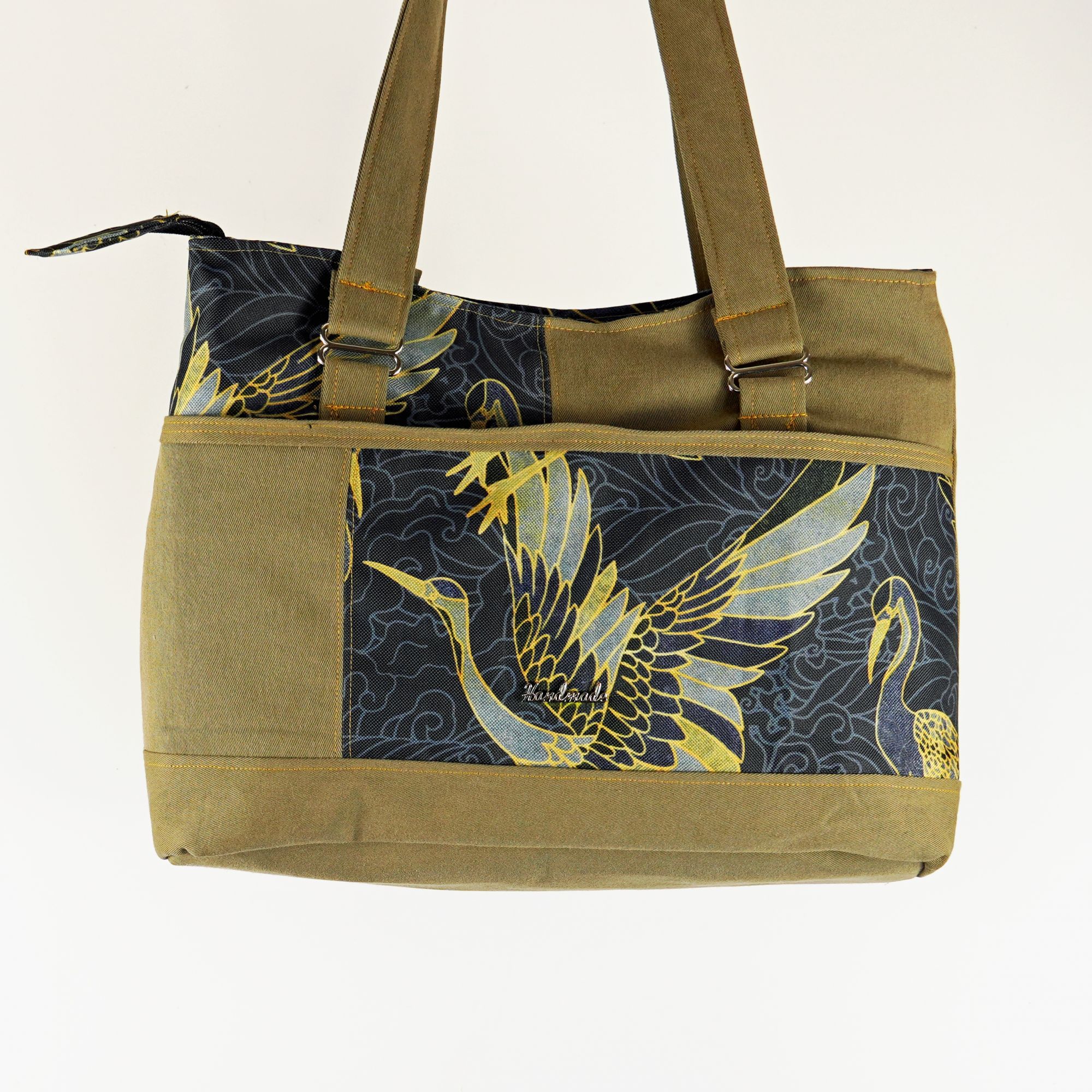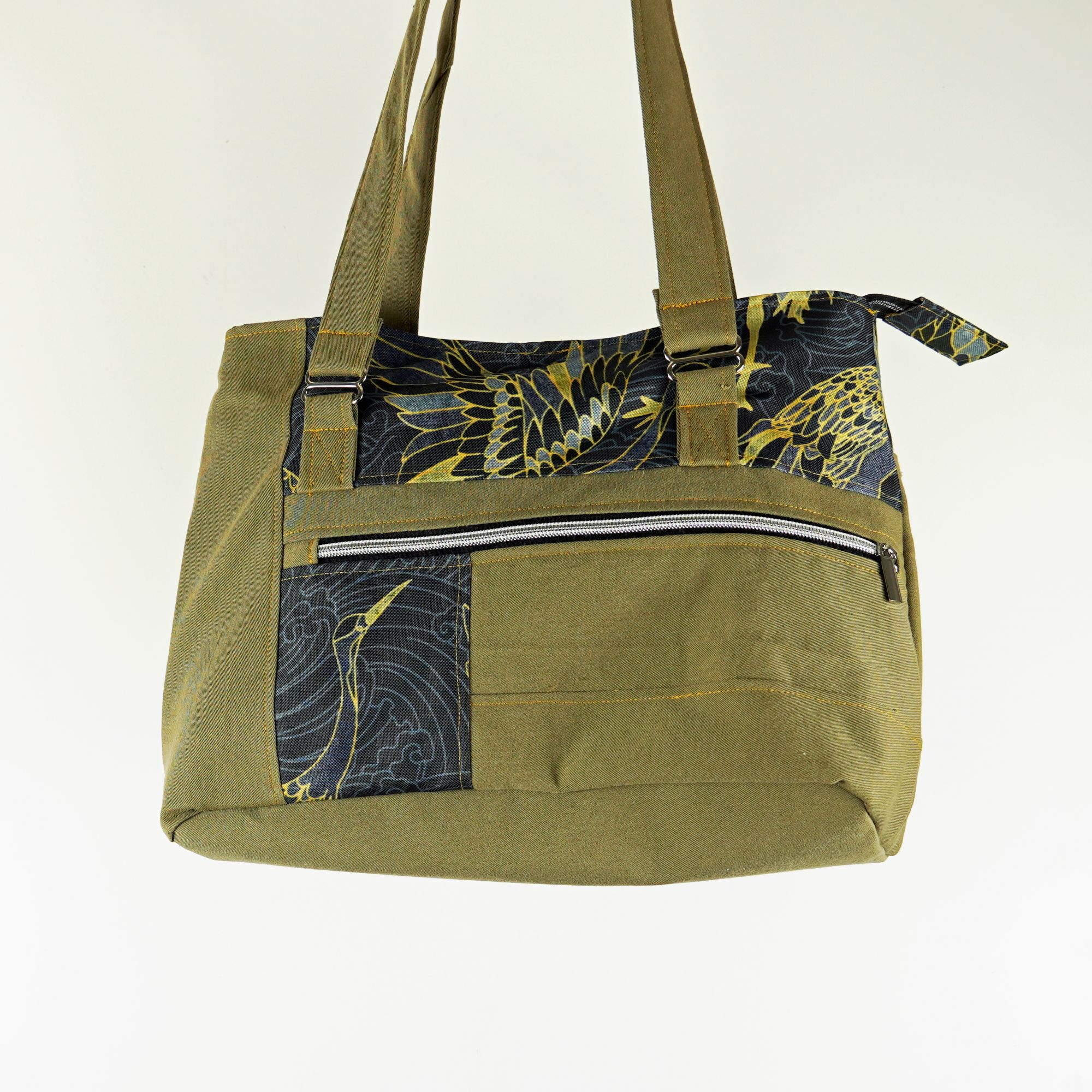 BxHxT ca. 35cm x 25cm x 11cm ; 2 Henkel je 85 cm ; 1 Reißverschlussfach außen, 1Steckfach mit Magnetverschluss außen, 1 Reißverschlussfach und ein Steckfach innen
