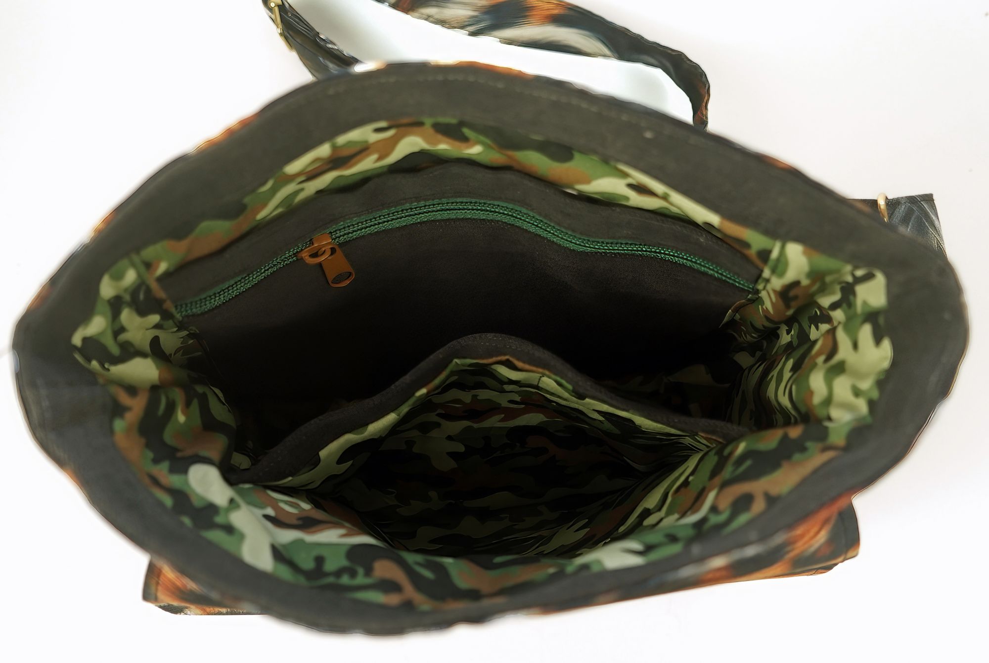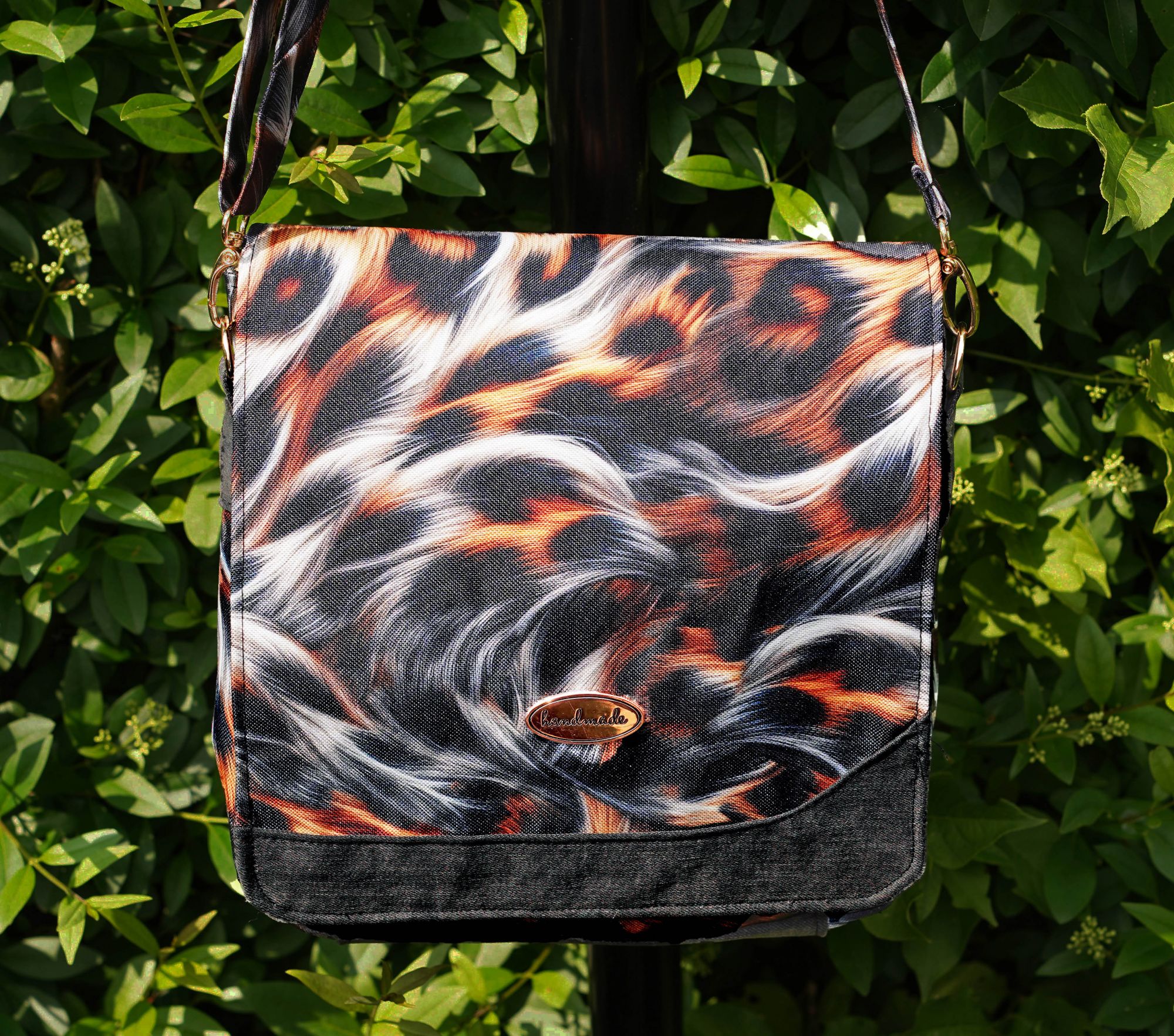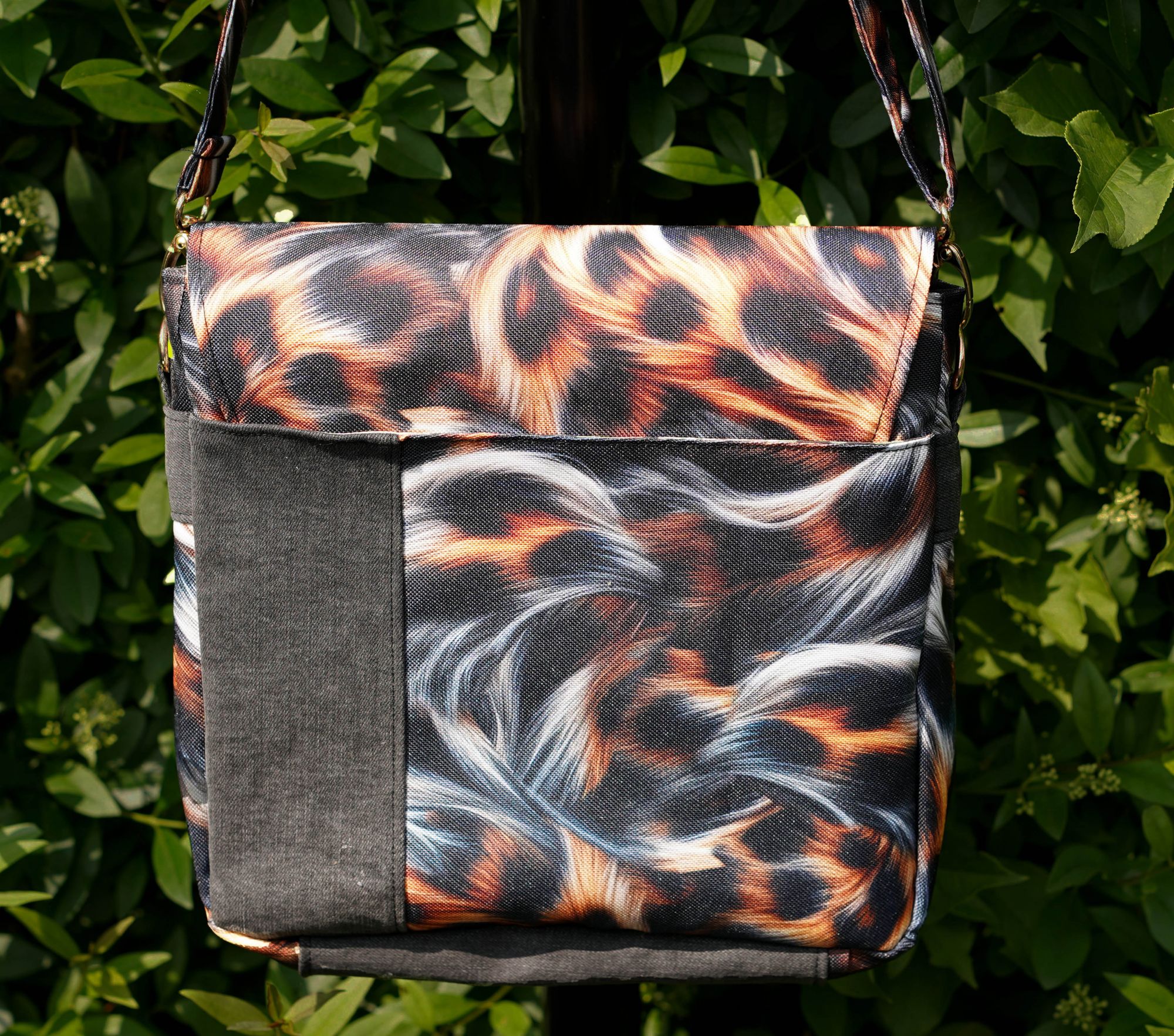 Animal Print ; BxHxT: 25cm x 24cm x 7cm ; 5 Steckfächer außen ; 1 Reißverschlussfach und 2 Steckfächer innen ; verstellbarer Gurt ca. 140 cm ; Material: wasserabweisender Stoff(Handwäsche möglich)